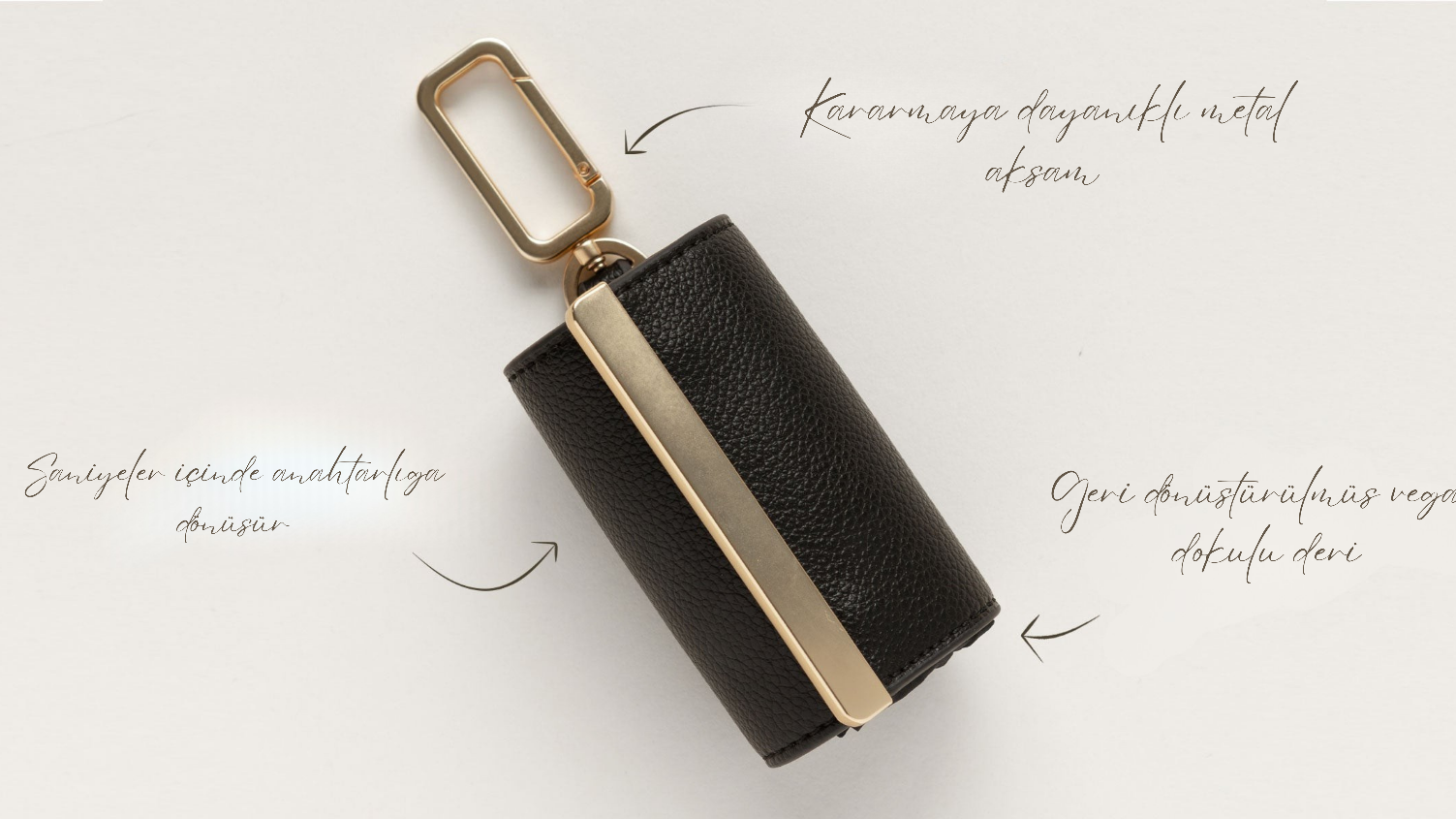 Patentli Keote, üstün malzemeleri ve özenli tasarımı bir araya getiriyor: kararmaya dayanıklı metal aksam, geri dönüştürülmüş vegan deri ve özel yırtılmaya ve suya dayanıklı naylon; böylece kompakt bir anahtarlıktan, 22 kg'a kadar ağırlığı kolaylıkla taşıyabilen tam boyutlu bir el çantasına dönüşüyor.